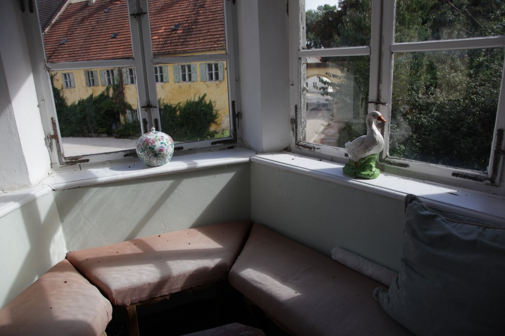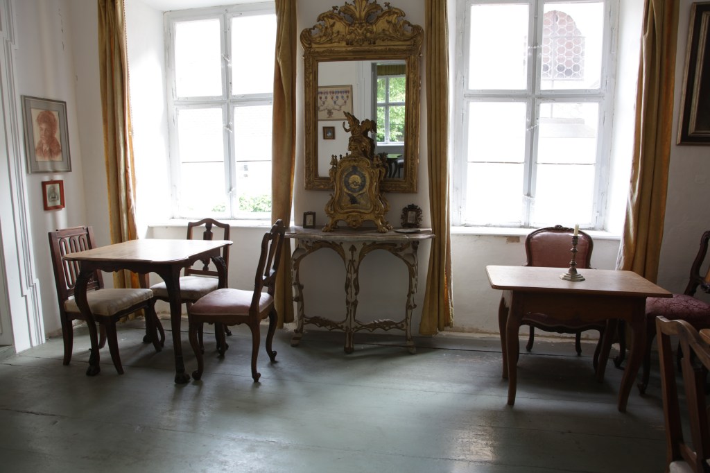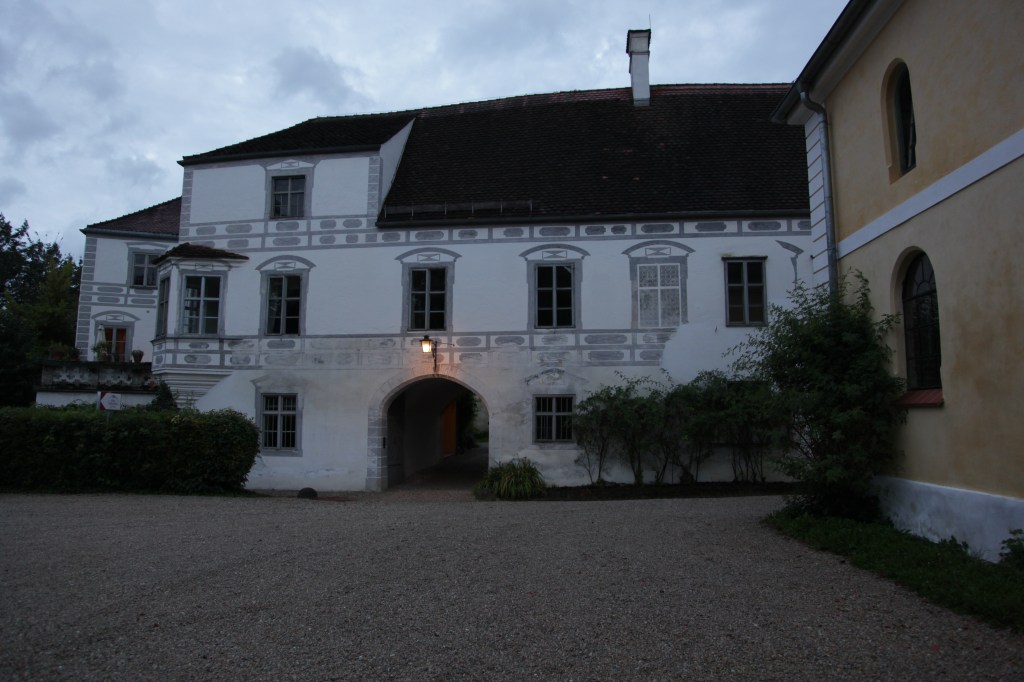 When I was a governess there, all the castle buildings were painted yellow with white trim, as seen in the building on the right (once a barn, but now a convention center). Then it was time to repaint. Since it was a historic building, dating from the 15th century, the government was involved.